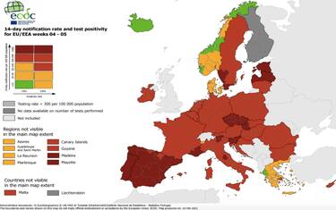 In un'altra mappa diffusa dall'Ecdc si vede l'incidenza dei test positivi sul numero di abitanti dei Paesi dell'Unione
