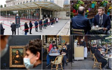 Covid, la Francia riapre: tavoli pieni e code ai musei. Macron beve il caffè al bar. FOTO