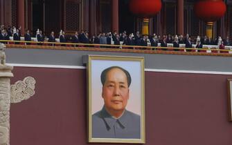 La gran parte del discorso di Xi ha puntato sui successi del Partito Comunista nei 100 anni, compreso il rispetto per gli ex leader Mao Zedong (nella gigantografia della foto) e Deng Xiaoping