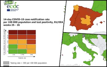 La Spagna e il Portogallo sono le uniche regioni in Europa a essere classificate come zone rosse. Vuol dire che nelle ultime due settimane hanno avuto un aumento dei contagi compreso tra 75 e 200 casi ogni 100mila abitanti e un tasso di positività superiore al 4% oppure contagi tra 200 e 500 ogni 100mila persone