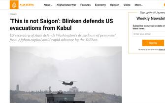 Al Jazeera dà spazio anche al segretario di Stato Usa John Blinken che tenta di allontanare il paragone con la guerra in Vietnam. "Questa non è Saigon: Blinken difende l'evacuazione Usa da Kabul", è il titolo della testata araba