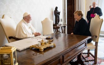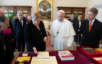 Papa Francesco ha ricevuto in Vaticano Angela Merkel e l'incontro, a porte chiuse, è durato circa 45 minuti. Il Pontefice ha donato alla cancelliera un quadro in bronzo raffigurante la Porta Santa della basilica vaticana e diversi volumi con le sue Encicliche, il Messaggio per la pace di quest'anno e il Documento sulla Fratellanza umana. Merkel ha invece donato a Papa Francesco un volume su Michelangelo, tre libri con i commenti ai Vangeli e alcuni prodotti alimentari