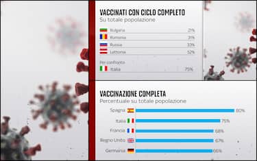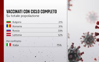 La quarta ondata della pandemia di Covid sta colpendo duramente alcuni Paesi in cui la campagna vaccinale non procede a ritmi spediti. Rispetto all'Italia che ha vaccinato il 75% della popolazione totale con ciclo completo, la Bulgaria si ferma al 21%, la Romania al 31% e la Russia al 33%. Poco sopra il 50% la Lettonia