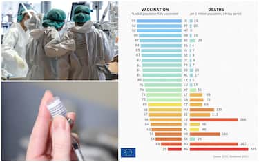 La Commissione europea ha pubblicato - il 23 novembre - un grafico sul suo profilo Twitter dove mostra quanto i vaccini siano fondamentali per combattere i decessi a causa del Covid-19. I dati mostrano che più è alto il tasso di vaccinazione, più basso è il tasso di mortalità. Al contrario, nei Paesi dove la copertura vaccinale è più bassa, il numero di morti per abitante è molto più alto