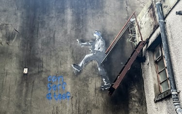 Un uomo con giacca e pantaloni con gli occhi bendati che sta per cadere da una scala è comparso nella città britannica. L'opera, priva di firma, non è stata ancora rivendicata da nessuno. Lo stile è molto simile a quello dello street artist di Bristol che già nel dicembre 2018 realizzò a Port Talbot, a pochi chilometri, 'Season's greetings', una denuncia contro l'inquinamento