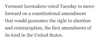 Vermot & abortion - Il Vermont vuole diventare il primo stato americano dove l’aborto è protetto dalla Costituzione. Come riportato dal Washington Post, la Camera dello stato del nord-est ha votato a favore della proposta di un emendamento costituzionale che garantirebbe il diritto all'interruzione di gravidanza e alla contraccezione. Ora la misura passa al governatore repubblicano Phil Scott, che ha già segnalato il suo sostegno ed è tenuto a darne avviso pubblico prima che la proposta appaia nelle schede elettorali di novembre