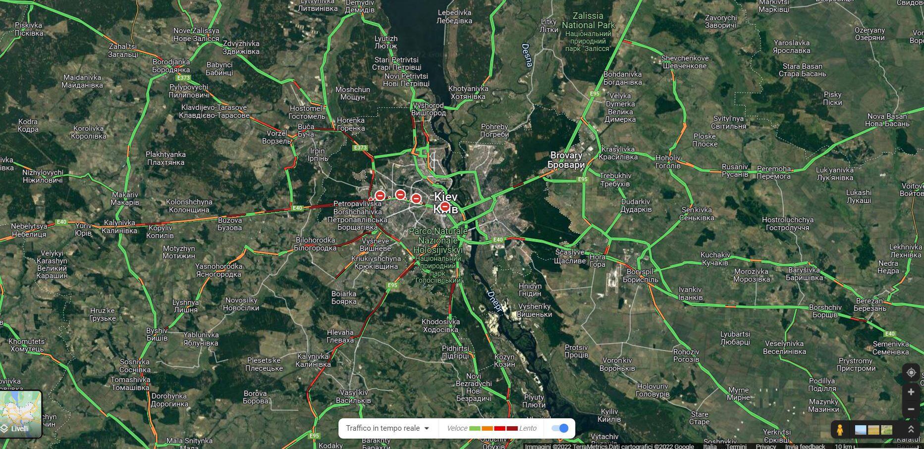 Le code di auto in uscita da Kiev in direzione ovest, verso l'Europa - da Google Maps