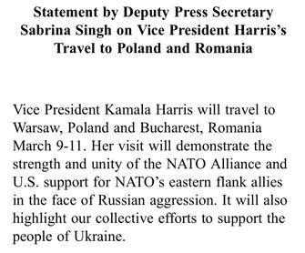 VP in Polonia e Romania – Kamala Harris sarà in Polonia e Romania dal 9 all'11 marzo per “dimostrare la forza e l’unità della Nato e il sostegno degli Usa agli alleati del fianco orientale dell’Alleanza atlantica di fronte all’aggressione russa”, secondo quanto riferito dal suo ufficio stampa