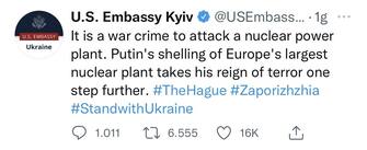 Tweet - Secondo la CNN, il Dipartimento di Stato Usa ha invitato le ambasciate americane in Europa a non ritwittare il cinguettio dell’ambasciata statunitense in Ucraina, che aveva definito un crimine di guerra l’attacco russo alla centrale nucleare di Zaporizhzhya. Segno, secondo la tv, che il governo Usa potrebbe non aver condiviso il messaggio della sua rappresentanza diplomatica in Ucraina