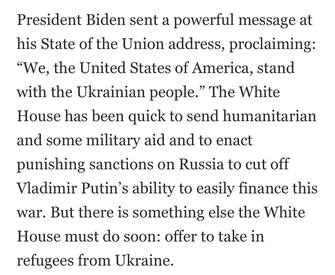 Rifugiati – “Perché Biden non sta accogliendo i rifugiati dall’Ucraina?”: è il titolo, e la domanda, di un editoriale del Washington Post. Il quotidiano sottolinea che il presidente ha mandato, un “messaggio potente” nel suo discorso sullo Stato dell'Unione, ha inviato rapidamente aiuti militari e umanitari a Kiev e sanzionato la Russia. E ha anche concesso lo status di protezione temporanea agli ucraini che si trovano in Usa