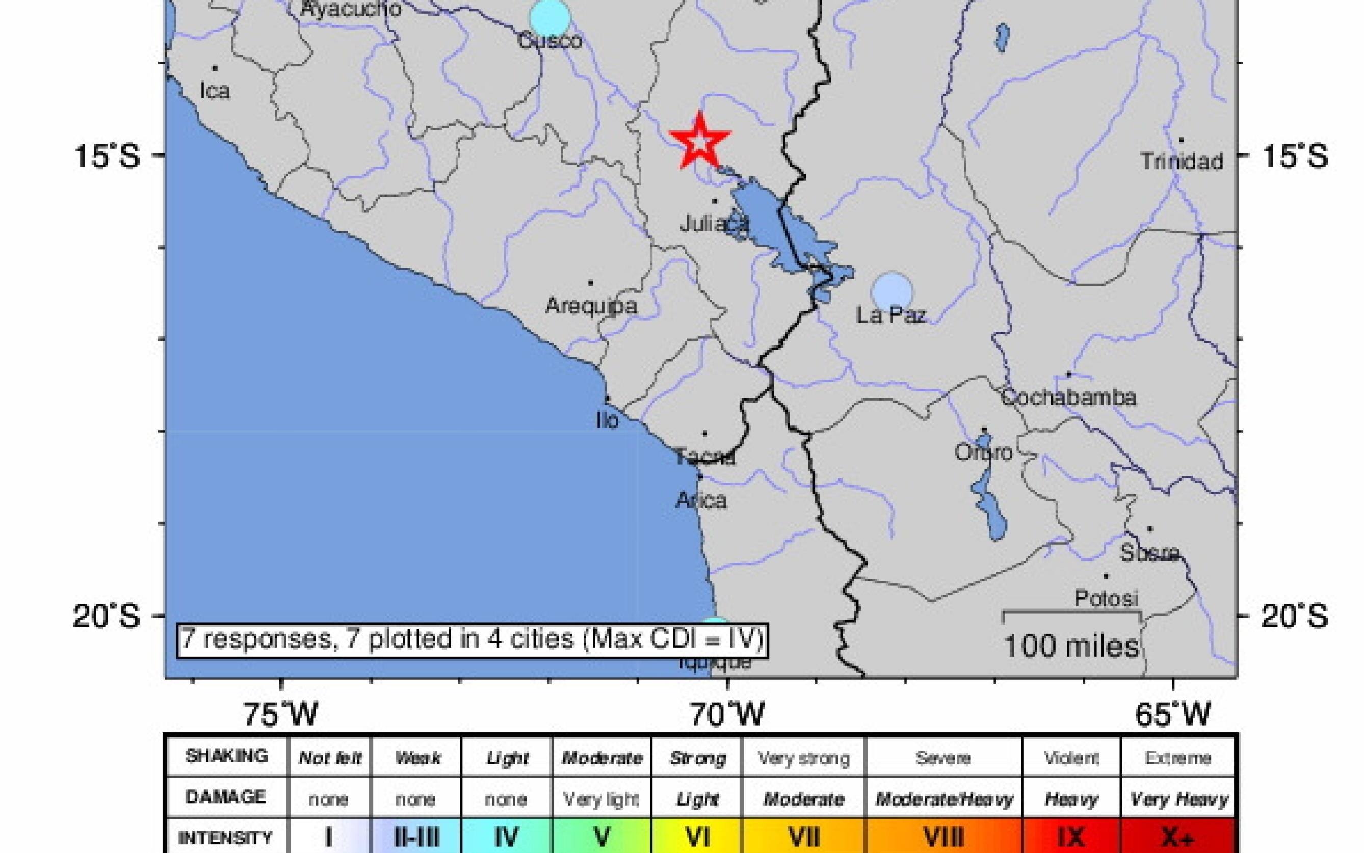 Un sisma di magnitudine 7.2 è stato registrato nel sud del Perù dal Servizio geologico Usa (Usgs). La scossa è stata rilevata alle 07,02 (le 14,02 italiane) anche dall'Istituto di geofisica del Perù (Igp), con epicentro a 20 chilometri a nord-est di Ayaviri, Melgar (provincia di Puno), e a una profondità di 240 chilometri. . Il terremoto è stato avvertito anche in Cile e in Bolivia.