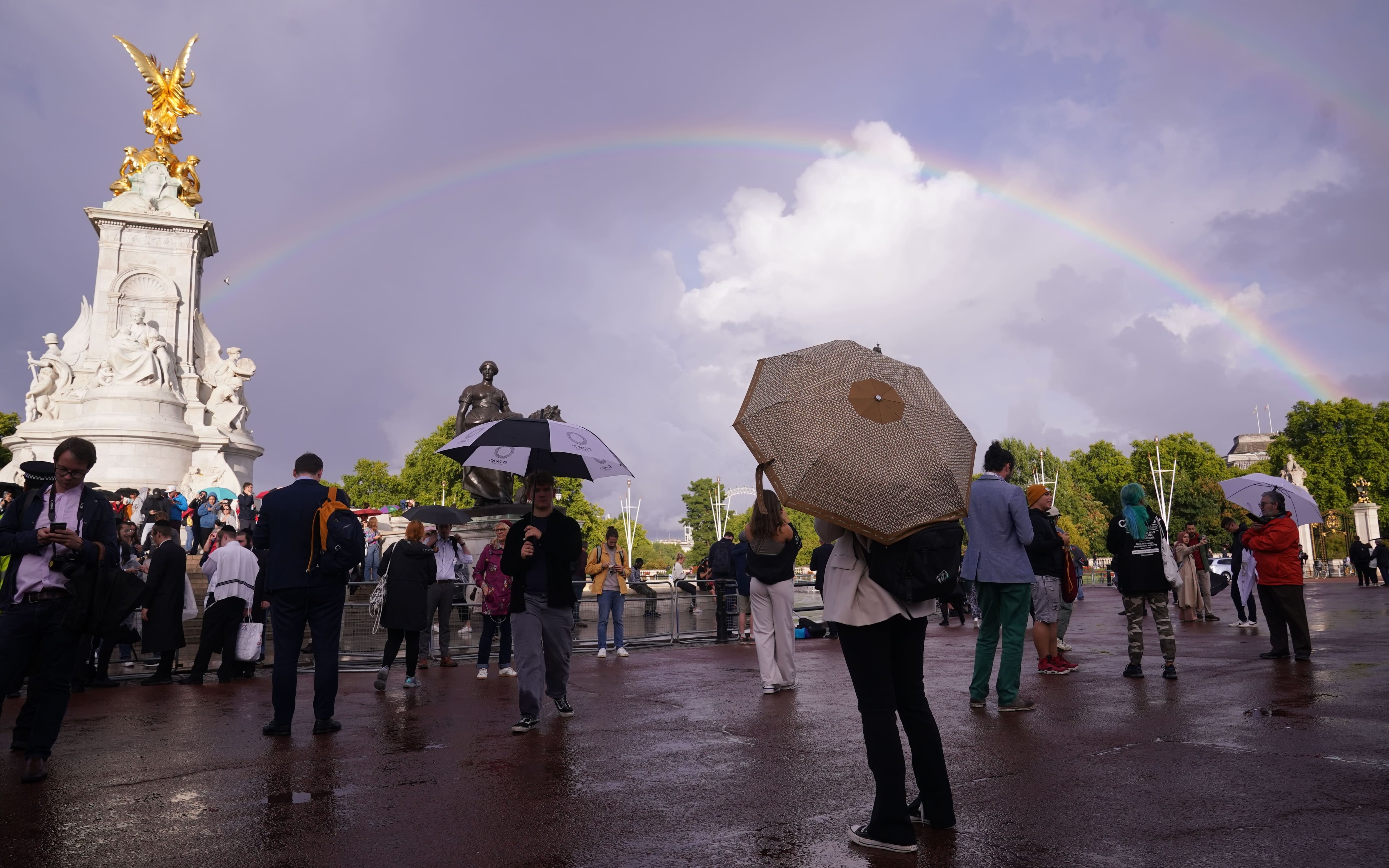 La bandiera a mezz’asta e poi, all’improvviso, un arcobaleno ad abbracciare il cielo sopra Buckingham Palace. Nei minuti dell’annuncio della morte della Regina Elisabetta II (IL LIVEBLOG - LO SPECIALE), dopo la pioggia caduta a lungo nel pomeriggio su Londra, è spuntato un arcobaleno, subito immortalato dalle tante persone assiepate davanti alla residenza ufficiale della monarchia. Non l’unico della giornata, a dire il vero. Negli stessi minuti è spuntato un arcobaleno anche sopra il castello di Windsor. Forse due segni del destino a cui stava andando incontro alla sovrana.