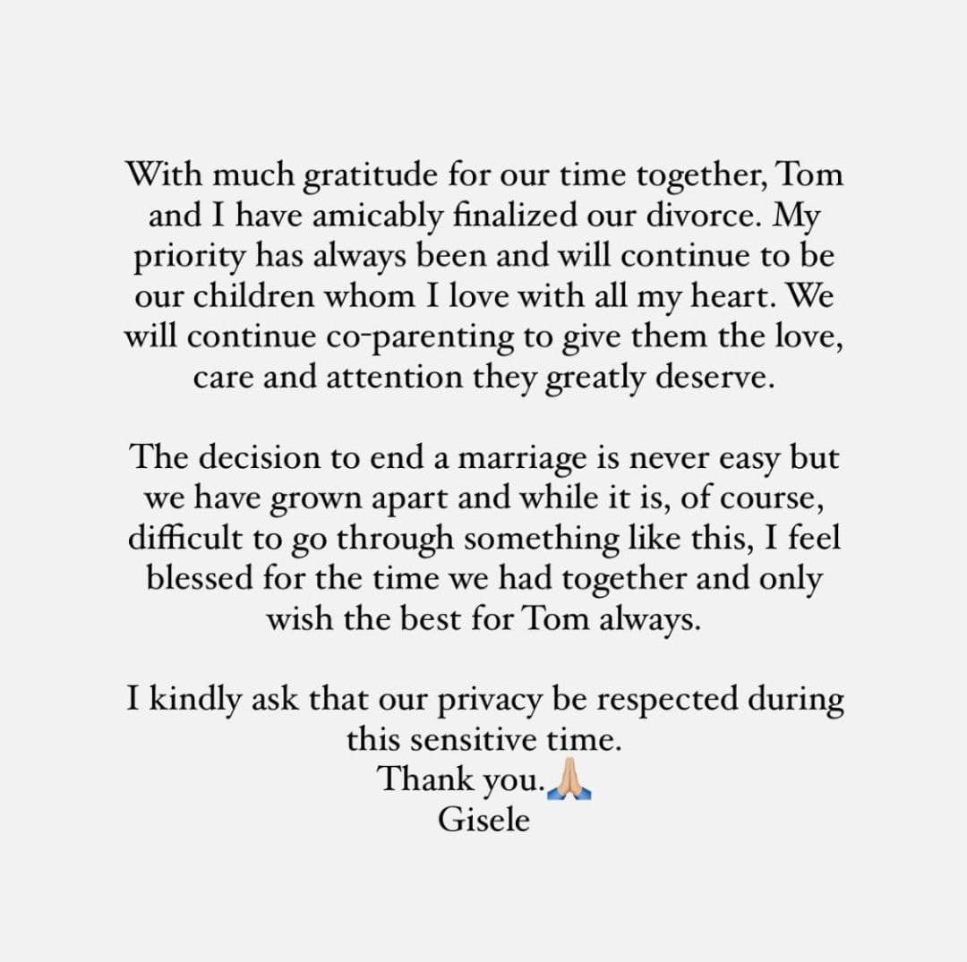 Arriva ufficialmente la parola "fine" tra Gisele Bündchen e Tom Brady dopo 13 anni di matrimonio. La coppia ha chiesto il divorzio. Anticipata dal settimanale statunitense People e confermata da una storia su Instagram pubblicata dalla stessa Gisele, la richiesta di divorzio è stata presentata in Florida, compreso un accordo sulla custodia congiunta dei figli, Benjamin di 12 anni e Vivian Lake di nove. Il fuoriclasse del football e la top model di origini brasiliane vivevano separati ormai da mesi.