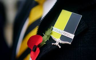 Un dettaglio della spilla a forma di papavero, simbolo del Remembrance Day, che tutti i partecipanti appuntano su giacche e vestiti, durante la giornata, per ricordare i caduti in guerra