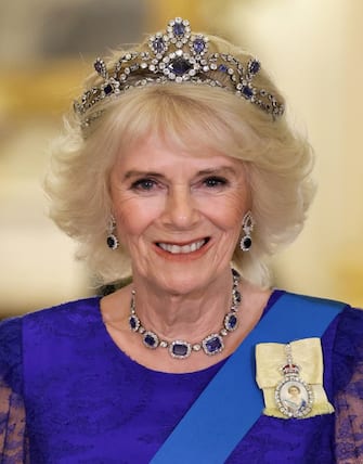 L’ABITO E GLI ACCESSORI DI CAMILLA – Una prima volta anche quella di Camilla, per la prima volta in veste pubblica come regina consorte. Per lei abito blu e tiara di zaffiri e diamanti, nota anche come Modern Sapphire Tiara, abbinata al George VI Sapphire Set e al Modern Sapphire Bracelet. La collana fa parte di una parure, contenente anche orecchini, un anello e una brooch, acquistata da Re Giorgio VI nel 1947 da Carrington & Co come regalo di nozze per la figlia, la futura regina Elisabetta