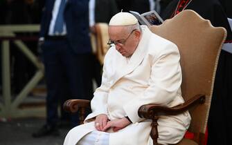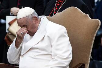Nella foto, papa Francesco commosso. Prima di ripartire per il Vaticano, il pontefice ha spiegato anche i motivi della sua commozione riguardo alla guerra: "Sì, è un grande dolore. Grande... Una sconfitta per l'umanità. Preghiamo eh?"