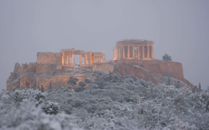 Ondata di gelo in Grecia. Una spolverata di neve ha imbiancato l'Acropoli e altri monumenti antichi di Atene. Anche nei prossimi giorni le temperature minime si spingeranno abbondantemente sotto lo zero