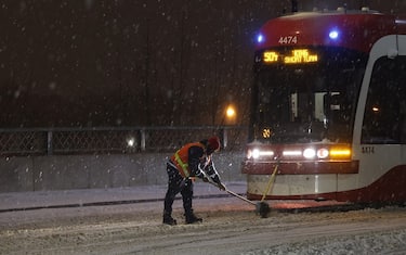 La tempesta invernale ha colpito anche l'Ontario meridionale e attraversato il quartiere di Riverside. Uno spazzaneve sgombera King Street East vicino a Queen Street East