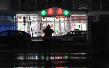 In foto: la polizia all'esterno della farmacia dove ha avuto luogo il sequestro