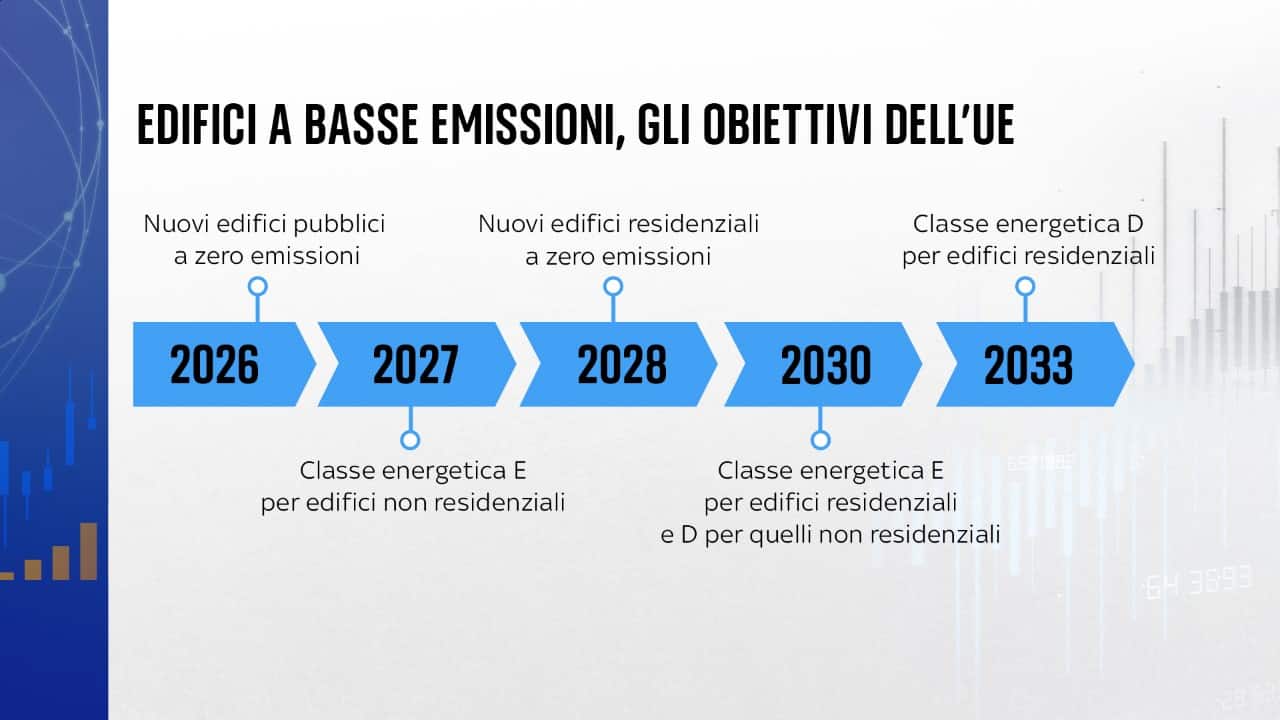 Secondo la Commissione europea gli immobili dell'Ue sono responsabili del 40% del consumo energetico e del 36% delle emissioni di gas serra. La direttiva votata a Strasburgo prevede una serie di obiettivi per risolvere questo problema. Tra questi, l’obbligo per gli edifici che saranno costruiti dal 2028 di essere a zero emissioni e l'obiettivo di non avere immobili con una classe energetica inferiore alla “D” dal 2033.