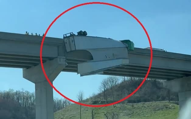 Un incidente spettacolare e per fortuna senza gravi conseguenze. È avvenuto lo scorso 12 aprile, ma le immagini (girate da Tyler Maltony e rese pubbliche da Storyful) sono state diffuse solamente nelle ultime ore. Siamo negli Stati Uniti, nel sud ovest della Pennsylvania. Un camion finisce fuori strada proprio mentre sta attraversando un cavalcavia nella Contea di Washington, si ribalta e resta “aggrappato” alla struttura del ponte, quasi penzoloni. La polizia, che ha ricostruito l’accaduto, ha spiegato che l’autista del camion è riuscito a mettersi in salvo, saltando fuori dal mezzo, e ha riportato solo lievi ferite.