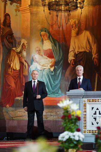 In abito scuro, con una candela in mano, il capo del Cremlino, accompagnato dal sindaco di Mosca, Sergei Sobyanin, ha risposto con il tradizionale “È veramente risorto" alle parole del patriarca