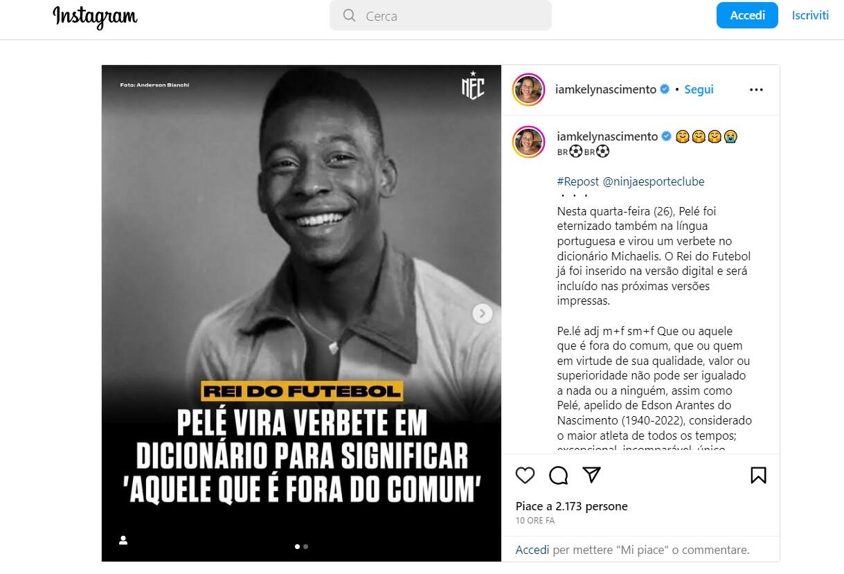MondoLa notizia è stata diffusa dalla figlia su Instagram. La parola "Pelè" diventa "qualcosa o qualcuno che è fuori dal comune, chi, in virtù della sua qualità, valore o superiorità non può essere eguagliato a niente e nessuno"