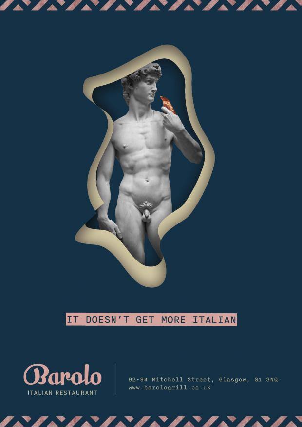 A scegliere di utilizzare in un poster l’iconica scultura è stato un ristorante del centro di Glasgow: il David mangiava una pizza e riportava la frase “Non c’è niente di più italiano”. A nulla è valso coprire le parti intime, nude, dell’opera con degli adesivi del tricolore, giudicati “non abbastanza grandi”. La pubblicità finale, approvata e ristampata, presenta la scultura di marmo tagliata in vita
