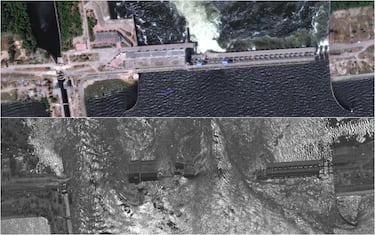 In queste immagini satellitari di Maxar, diffuse dal Guardian, è possibile vedere gli effetti di quanto accaduto con immagini del prima e del dopo nei pressi della diga
