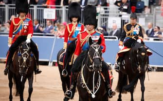 Il Re ha raggiunto in auto la Horse Guards Parade per poi montare in sella, mentre la regina Camilla e la principessa del Galles Kate hanno seguito il corteo in carrozza insieme ai principi George, Charlotte e Louis in calzoncini rossi