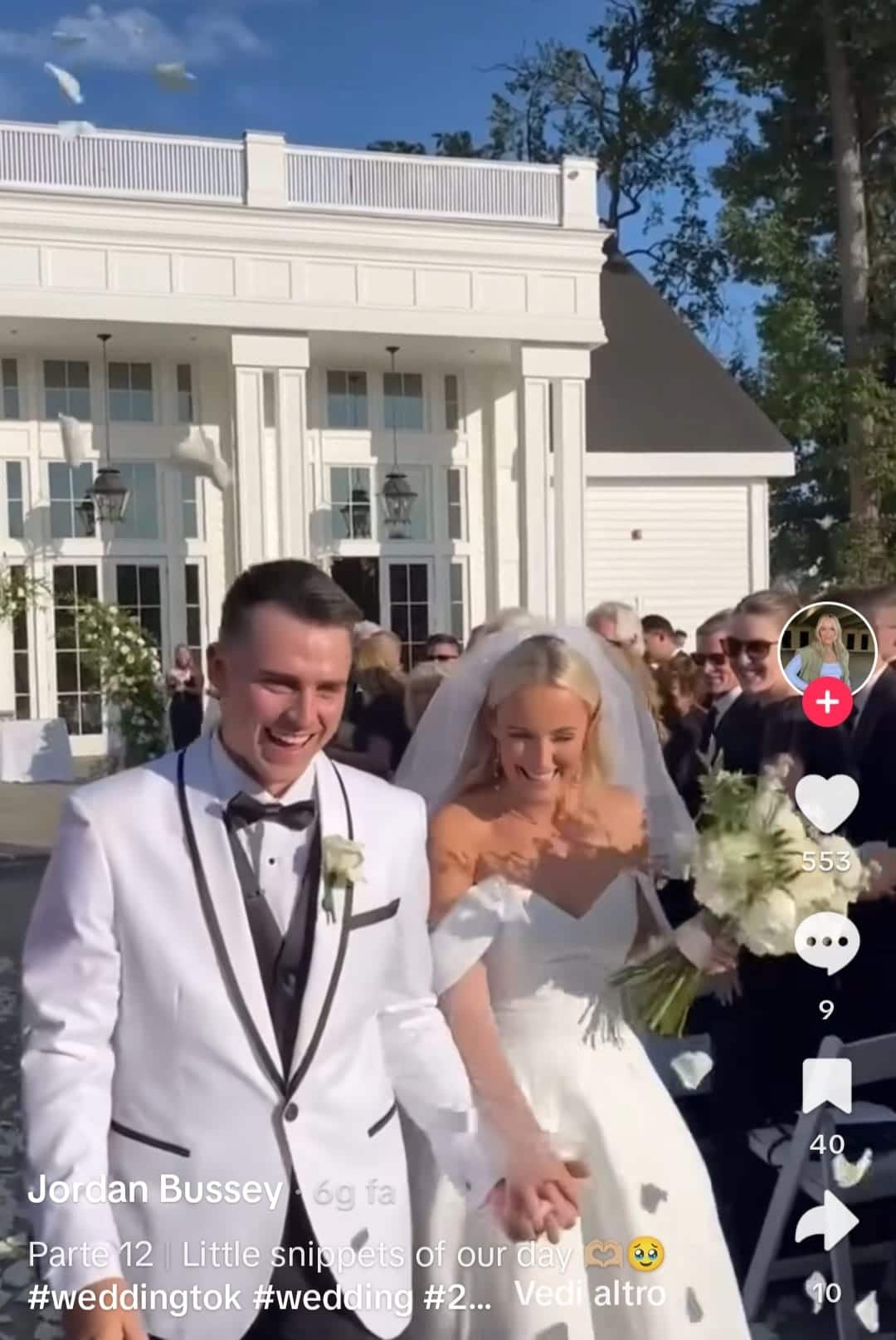 La sposa invece ha scelto per se stessa un tradizionale abito bianco a strascico e il marito l'ha accompagnata optando per una giacca bianca. Il contrasto tra sposi e invitati è stato ancora più evidente: secondo Jordan Bussey è stato "classy & elegant".