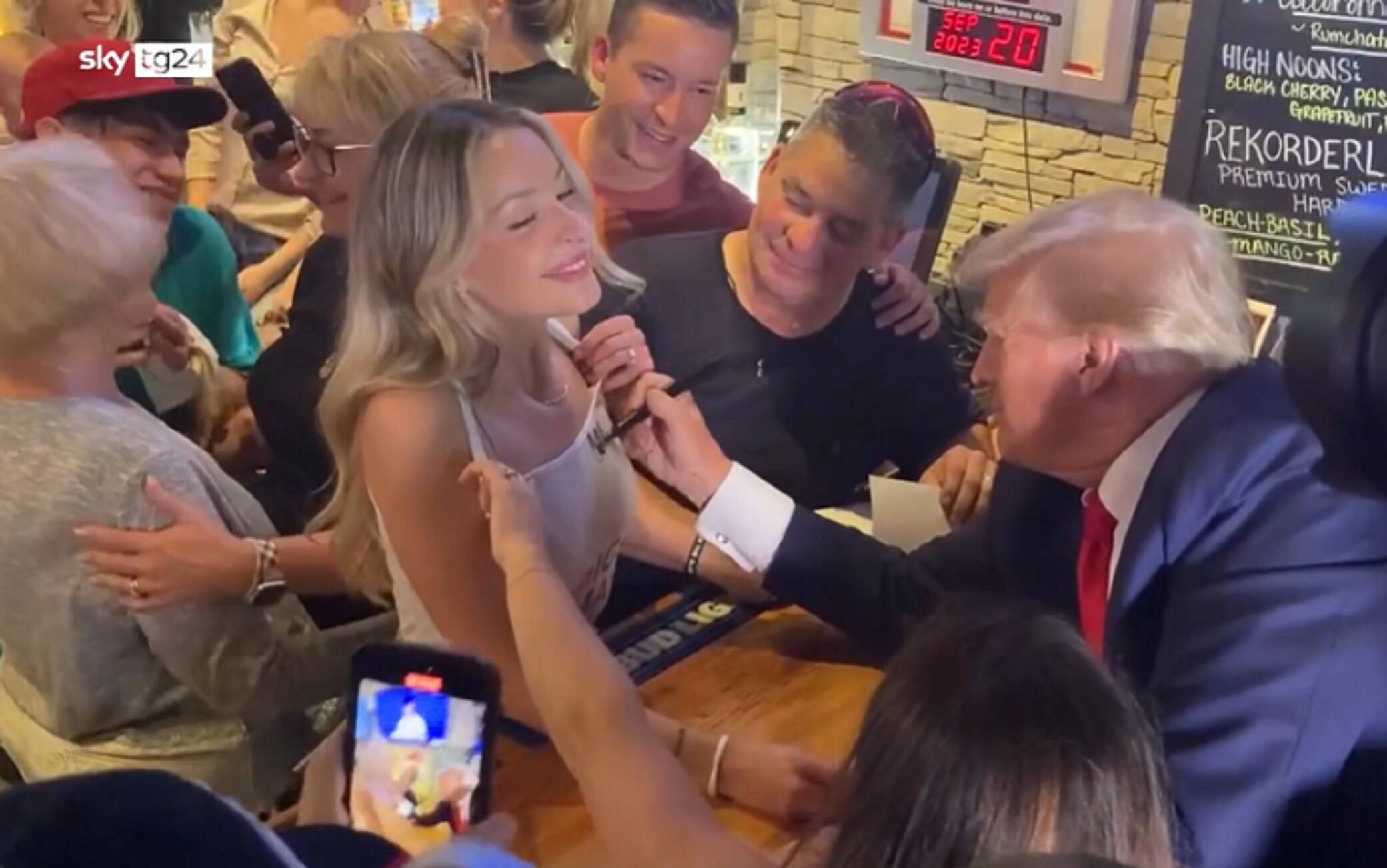 Su richiesta di una sua supporter, Donald Trump ha autografato il top della ragazza durante un incontro a Bettendorf, in Iowa, organizzato in supporto alla campagna per le primarie repubblicane in vista delle elezioni per la Casa Bianca che si svolgeranno negli Stati Uniti nel 2024. L'Iowa è il primo Stato dove si terrà la sfida il prossimo gennaio.