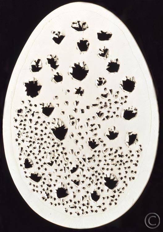 Si tratta di una grande tela di forma ovoidale, visceralmente bucherellata, minuziosamente dipinta di bianco, che parte da una valutazione tra i 18 e i 22 milioni di dollari