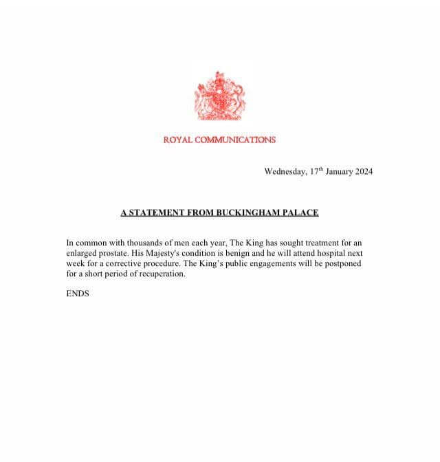 Come specifica il comunicato ufficiale, re Carlo III subirà una “procedura medica” e, per un breve periodo, sarà costretto a rinviare gli impegni pubblici per il recupero. “Come migliaia di uomini ogni anno, il Re si sottoporrà a un trattamento per un ingrossamento della prostata”, scrivono da Buckingham Palace. Come specifica la Bbc, si tratta di un disturbo comune negli uomini sopra i 50 anni d’età e, generalmente, non è una condizione grave.