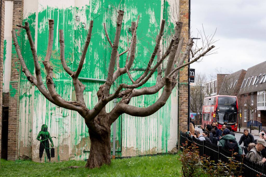 Il murale di un albero dipinto da Banksy su un edificio residenziale nel nord di Londra è stato deturpato con vernice bianca due giorni dopo la sua prima apparizione. L'opera d'arte di Finsbury Park presenta pennellate ruvide di vernice verde su un muro vicino a un albero, dando un aspetto astratto del fogliame, con uno stencil di una persona che tiene un tubo a pressione accanto ad esso. Le immagini condivise mercoledì sui social media hanno mostrato che il murale su Hornsey Road sembrava essere stato parzialmente coperto. Banksy ha rivendicato il murale come suo in un post su Instagram. Da quando è apparso il murale, è stata installata una recinzione attorno all'albero e al muro.