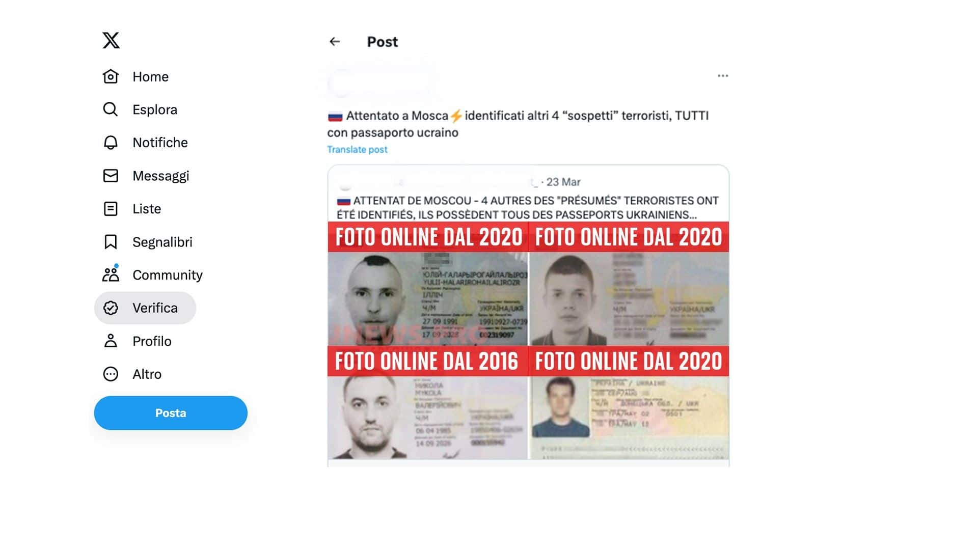 Online circolano anche documenti di identità ucraini falsamente attribuiti agli attentatori. Un'analisi effettuata da SkyTg24, utilizzando la ricerca per immagini, ha permesso di tracciare l'origine delle foto di questi documenti. Sono tutte disponibili online da molti anni e appartengono a individui non riconducibili all’attentato. Ad esempio, è stata identificata la foto di un documento appartenente a un uomo che è stato ricercato dalla polizia ucraina, la cui immagine era stata diffusa pubblicamente. Un altro documento, invece, è stato trovato nella pagina di Wikipedia dedicata al "Passaporto ucraino", nella versione in lingua russa.