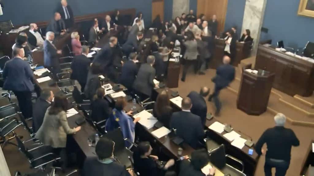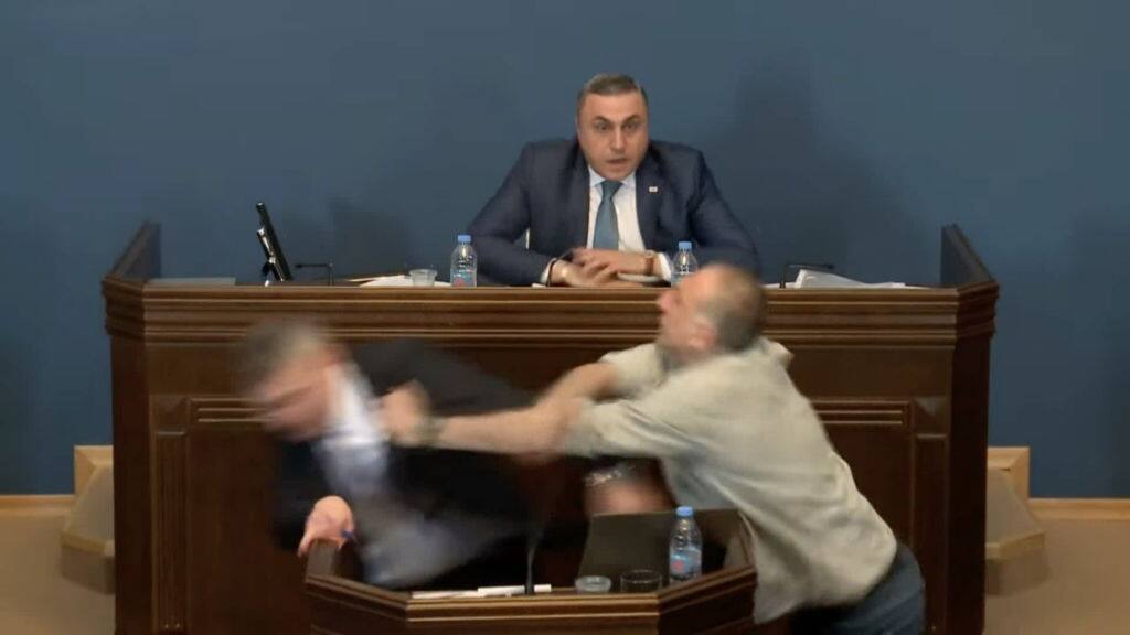 Il filmato trasmesso dalla televisione georgiana mostrava Mamuka Mdinaradze, leader della fazione parlamentare del partito al governo Sogno georgiano e forza trainante del disegno di legge, ricevere un pugno in faccia dal deputato dell'opposizione Aleko Elisashvili