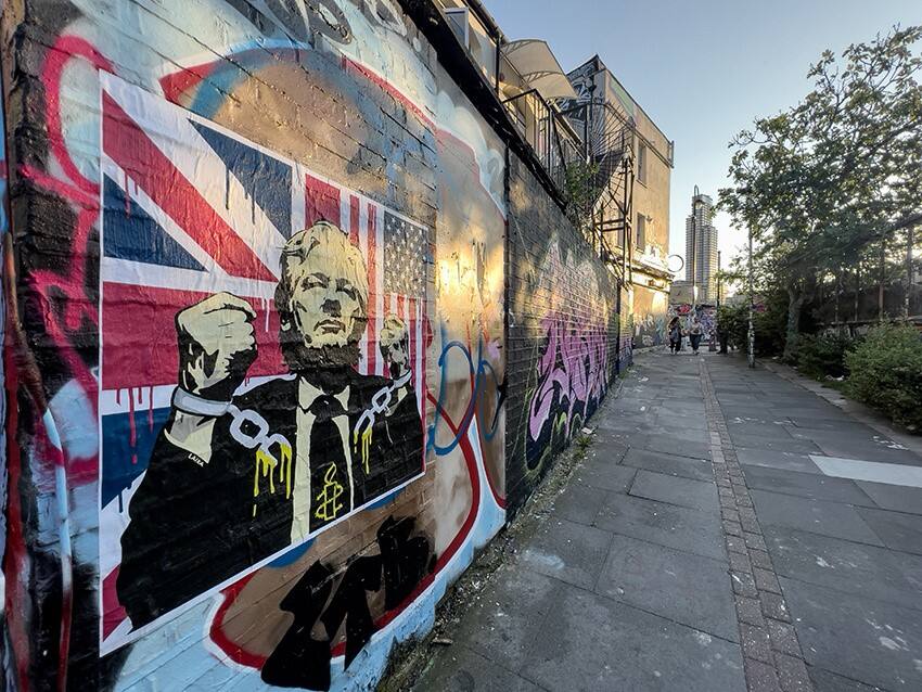 Il poster affisso nei pressi di Brick Lane, ritrae Assange che si libera dalle manette grazie a una candela che le scioglie. Particolari importanti. La candela è infatti il simbolo di Amnesty International, Ong che fin dall’inizio si batte contro l’estradizione del fondatore di WikiLeaks. Sullo sfondo campeggiano le bandiere USA e del Regno Unito: i due stati che hanno in mano le sorti del giornalista.