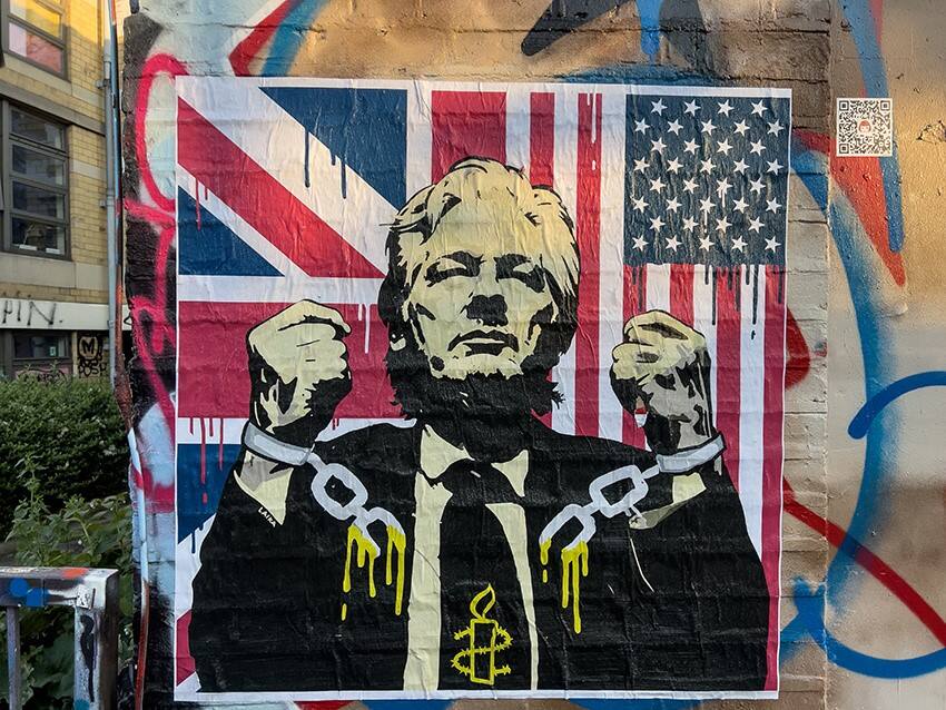In occasione dell'udienza per decidere le sorti del giornalista, la street artist Laika gli ha dedicato la sua nuova opera dal titolo “Melt the Chains”. Lunedì 20 maggio l’Alta Corte di Giustizia britannica stabilirà se il fondatore di WikiLeaks potrà opporsi alla richiesta di estradizione negli Stati Uniti