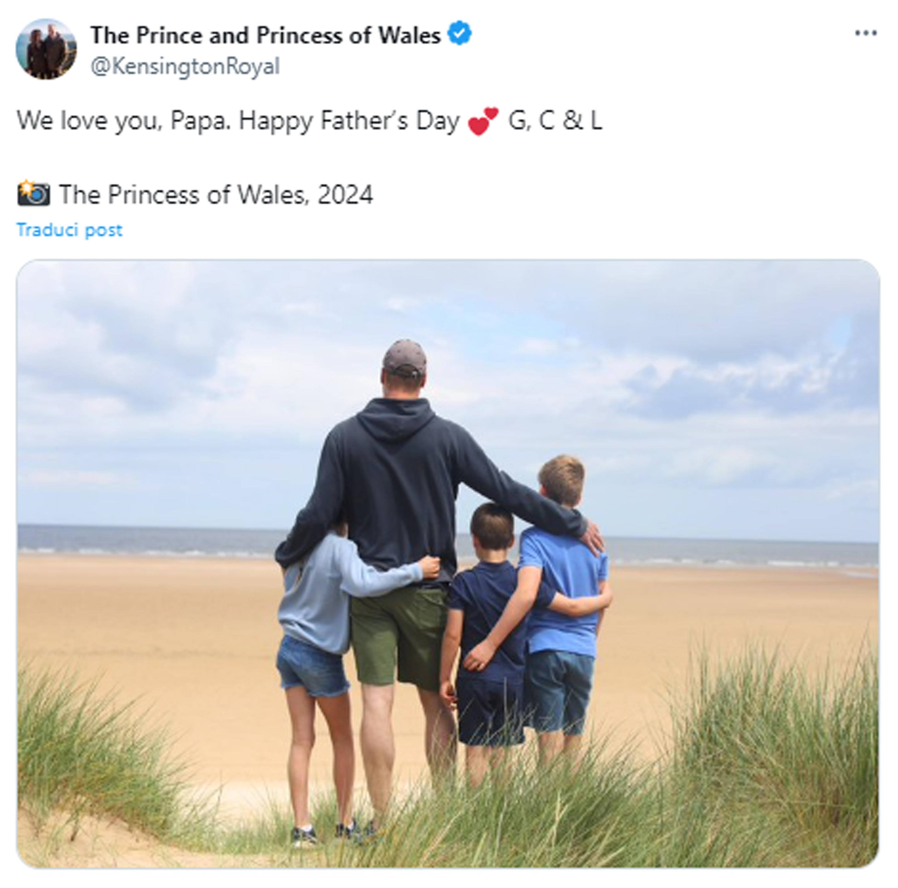 La festa del papà nel Regno Unito cade la terza domenica di giugno e per gli auguri è stata usata una foto scattata dalla principessa Kate, appena riapparsa in pubblico dopo l'inizio delle cure per un tumore.Il messaggio, postato sull'account del principe e della principessa, si e' chiuso con due cuori rossi e le lettere "G, C & L". L'immagine, scattata durante un viaggio in Norfolk a maggio, ritrae William di spalle e in piedi che abbraccia i figli su una spiaggia mentre guardano tutti il mare. Il messaggio e' preceduto dagli auguri dello stesso principe del Galles a suo padre: "Buona Festa del Papa'", ha scritto William su una foto del 1984 che lo ritrae bambino mentre gioca a calcio insieme a Carlo, da un anno re d'Inghilterra.