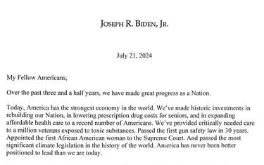 Mondo"Una decisione nell'interesse della nazione e del partito", ha scritto su X il candidato democratico per le presidenziali negli Stati Uniti, nella lettera in cui annuncia il suo ritiro dalla corsa alla Casa Bianca. L'attuale presidente dà il suo appoggio a Kamala Harris che ha promesso: "Mi guadagnerò la nomination"