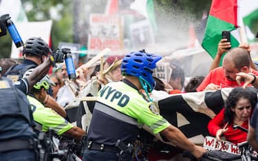 Capitol Hill è blindato da ore, protetto da alte recinzioni metalliche, come dopo l'assalto del 6 gennaio 2021, e da migliaia di agenti con cani e bici. Strade chiuse in tutta l'area circostante. Migliaia di manifestanti hanno gridato slogan contro Netanyahu "criminale di guerra", contro il "genocidio" e a favore della Palestina libera. Una folla enorme con cartelli, striscioni, fischietti, megafoni e bandiere palestinesi. "La folla non ha obbedito al nostro ordine di allontanarsi dalla linea della polizia. Stiamo usando spray al peperoncino contro chiunque cerchi di infrangere la legge e oltrepassare quella linea", ha fatto sapere la polizia in un comunicato. La polizia del Campidoglio ha anche allontanato e arrestato cinque persone che protestavano nella Galleria della Camera.