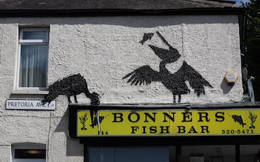 Ieri, nel quartiere di Walthamstow, sopra il ristorante Bonners Fish Bar, famoso per il "fish and chips", Banksy ha dipinto due pellicani che catturano una coppia di pesci, uno dei quali è integrato nell'insegna del locale. In precedenza, l'artista aveva creato l'immagine di un lupo che ulula all'interno di un'antenna parabolica a Peckham, nella parte sud-orientale di Londra. Tuttavia, quest'opera è stata rubata un'ora dopo la sua pubblicazione sui social network, giovedì. Un gruppo di uomini incappucciati è salito sul tetto del negozio con una scala, ha smontato l'antenna parabolica e ha corso lungo il viale con la creazione di Banksy davanti allo sguardo incredulo dei passanti.