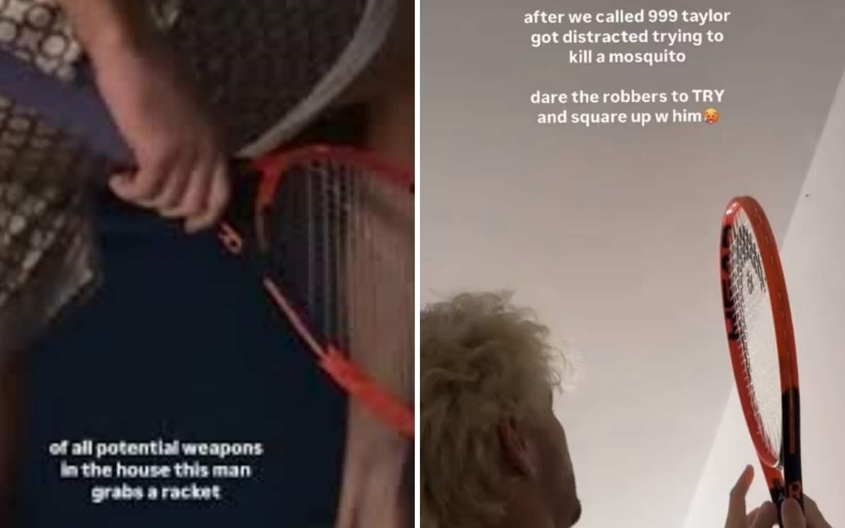 Attimi di paura per Fritz e Riddle che sono stati raccontati in una serie di storie su Instagram, nelle quali l'influencer cerca di smorzare la tensione di quei momenti facendo ironia sul suo compagno: "Tra tutte le potenziali armi in casa, quest'uomo afferra una racchetta da tennis", scrive Riddle. Mentre in una successiva storia in cui si vede il tennista con la racchetta in mano, l'influencer commenta: "Dopo aver chiamato il 999, Taylor si è distratto cercando di uccidere una zanzara".