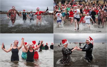 - I bagnanti sono partiti a corsa dalla spiaggia sfoggiando i loro abiti o costumi da bagno dalle fantasie natalizie, per poi tuffarsi, temerari, tra le onde del mare scozzese