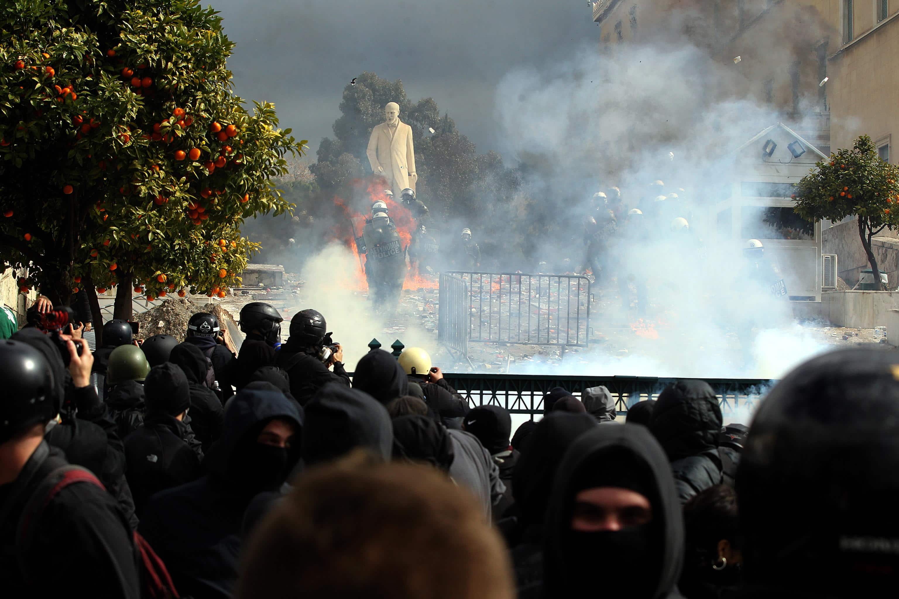 Piazza Syntagma, nel centro di Atene, si è trasformata in un campo di guerriglia urbana, con decine di antagonisti incappucciati che stanno lanciando molotov e pietre contro gli agenti in tenuta antisommossa fuori dal parlamento ellenico e nelle vie adiacenti di Ermou, Mitropoleos e Panepistimiou. Stando all'emittente statale Ert, quattro persone sono rimaste ferite durante gli scontri. Gli scontri ad Atene si stanno spostando ora verso piazza Omonia e il quartiere di Exarchia. Disordini si sono verificati anche nella seconda città della Grecia, Salonicco, in via Monastiriou davanti alla sede di Ose, l'Organizzazione delle ferrovie elleniche, dove un gruppo di persone con il volto coperto ha lanciato oggetti e pietre contro i poliziotti al termine della manifestazione che si è tenuta per l'anniversario dell'incidente, riporta Ert.