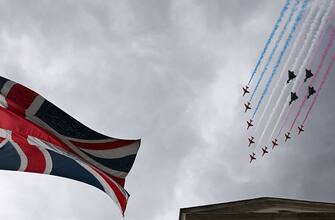 - Il sorvolo, preceduto da quello di altri aerei militari attuali e storici, si è compiuto sullo sfondo di un cielo londinese tinto di grigio ed è culminato sopra Buckingham Palace, dinanzi al quale s'erano radunati sudditi e curiosi all'ombra delle bandiere nazionali