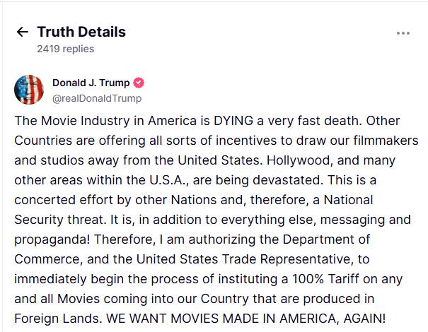"È ora di riportare la produzione cinematografica in America!", ha affermato il presidente degli Stati Uniti su Truth aggiungendo che altri Paesi stanno offrendo ogni sorta di incentivi per attirare i registi e studi cinematografici lontano dagli Stati Uniti