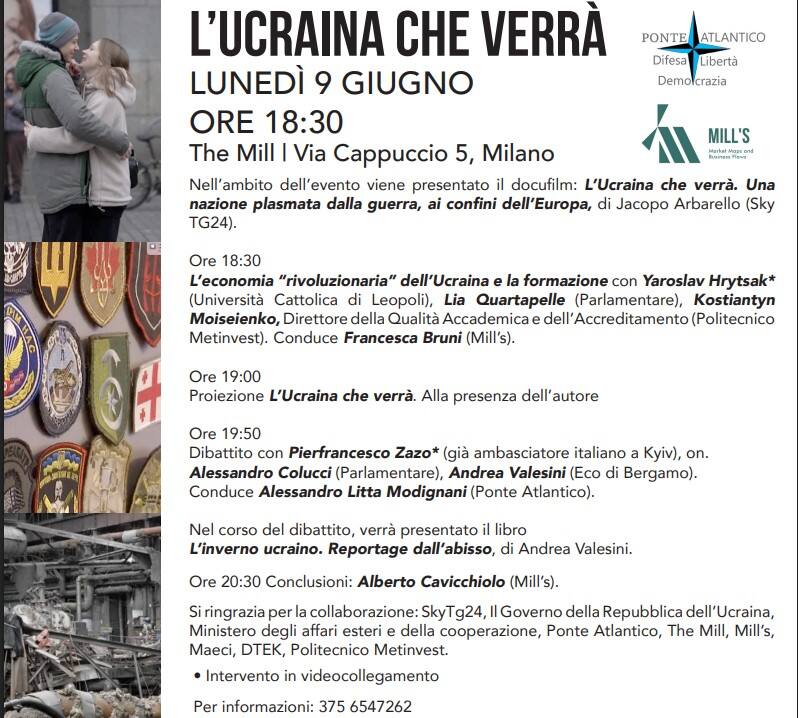 Lo speciale di Sky Tg24 L’Ucraina che verrà. Una nazione plasmata dalla guerra, ai confini dell’Europa, di Jacopo Arbarello (GUARDA LO SPECIALE), sarà presentato lunedì 9 giugno alle ore 18:30 presso The Mill in Via Cappuccio 5 a Milano.
