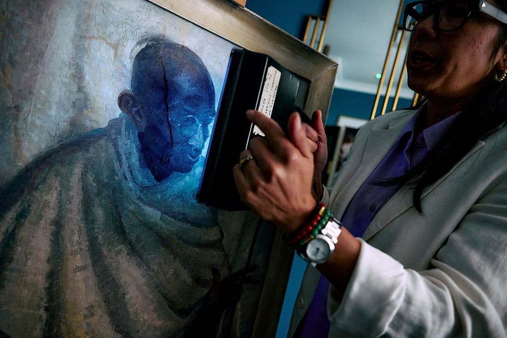 "Non solo si tratta di un'opera rara di Clare Leighton, nota principalmente per le sue incisioni su legno, ma si ritiene anche che sia l'unico dipinto a olio del Mahatma Gandhi per cui abbia posato", ha dichiarato Rhyanon Demery, responsabile vendite per la sezione Viaggi ed Esplorazioni di Bonhams